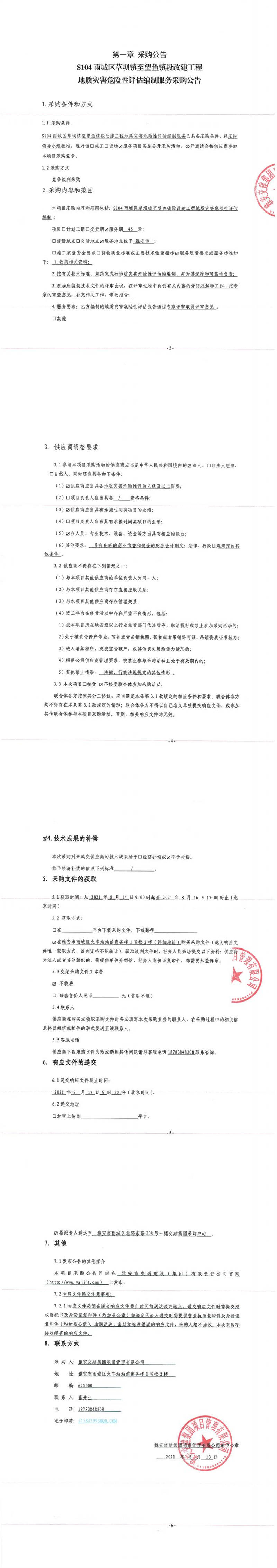 雅安交建集團項目管理有限公司S104雨城區(qū)草壩鎮(zhèn)至望魚鎮(zhèn)段改建工程地質災害危險性評估編制服務采購公告