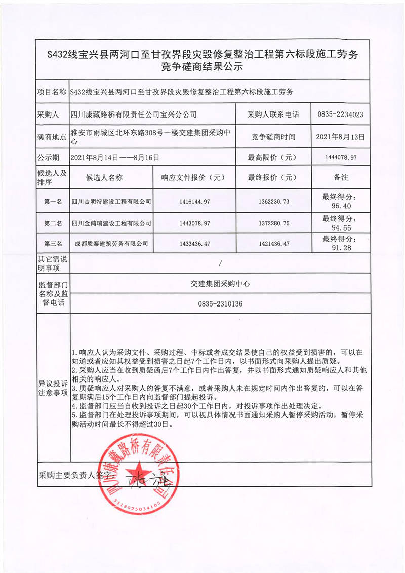 四川康藏路橋有限責(zé)任公司寶興分公司S432線寶興縣兩河口至甘孜界段災(zāi)毀修復(fù)整治工程第六標(biāo)段施工勞務(wù)競爭磋商結(jié)果公示