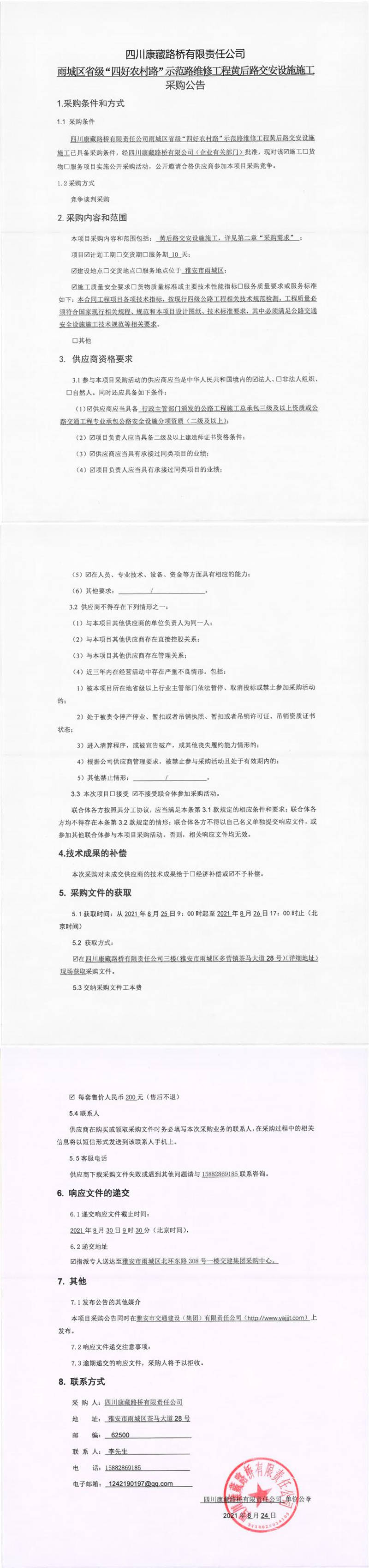 四川康藏路橋有限責任公司雨城區(qū)省級“四好農(nóng)村路”示范路維修工程黃后路交安設(shè)施施工采購公告