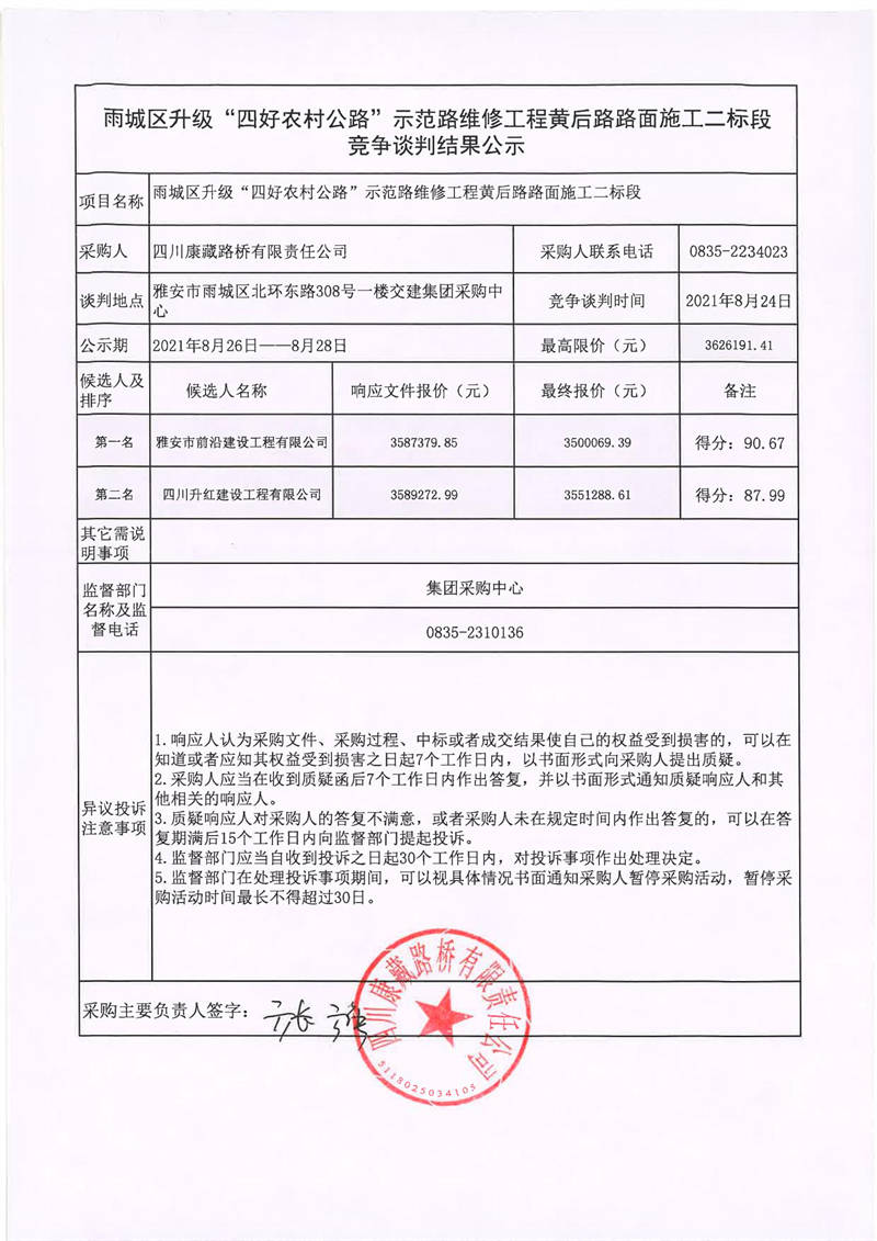 四川康藏路橋有限責(zé)任公司雨城區(qū)升級(jí)“四好農(nóng)材公路”示范路維修工程黃后路路面施工二標(biāo)段競(jìng)爭(zhēng)談判結(jié)果公示
