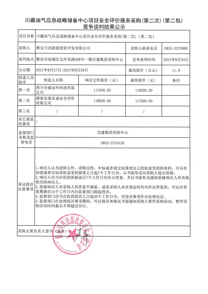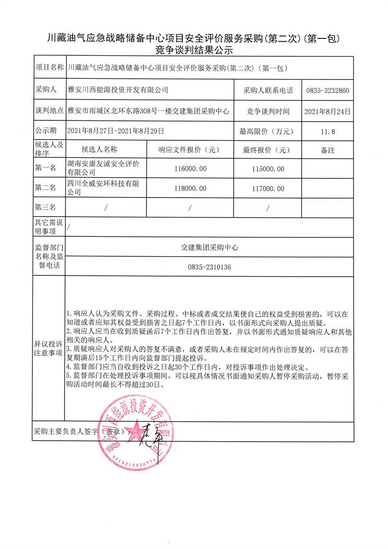 川藏油氣應(yīng)急戰(zhàn)略儲(chǔ)備中心項(xiàng)目安全評(píng)價(jià)服務(wù)采購(第二次)(第一包、第二包)競爭談判結(jié)果公示
