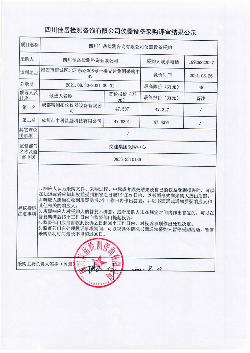 四川佳岳檢測咨詢有限公司儀器設(shè)備采購評(píng)審結(jié)果公示