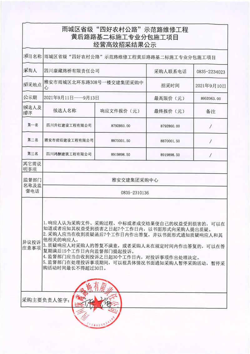 四川康藏路橋有限責(zé)任公司雨城區(qū)省級(jí)“四好農(nóng)村公路”示范路維修工程黃后路路基二標(biāo)施工專業(yè)分包施工項(xiàng)目經(jīng)營高效招采結(jié)果公示