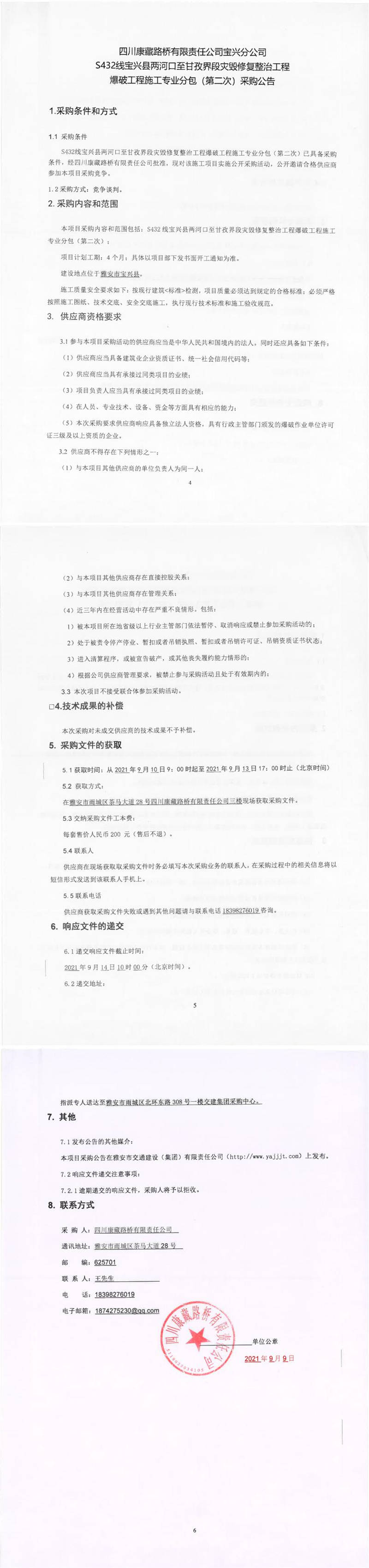 四川康藏路橋有限責任公司S432線寶興縣兩河口至甘孜界段災毀修復整治工程爆破工程施工專業(yè)分包(第二次)采購公告