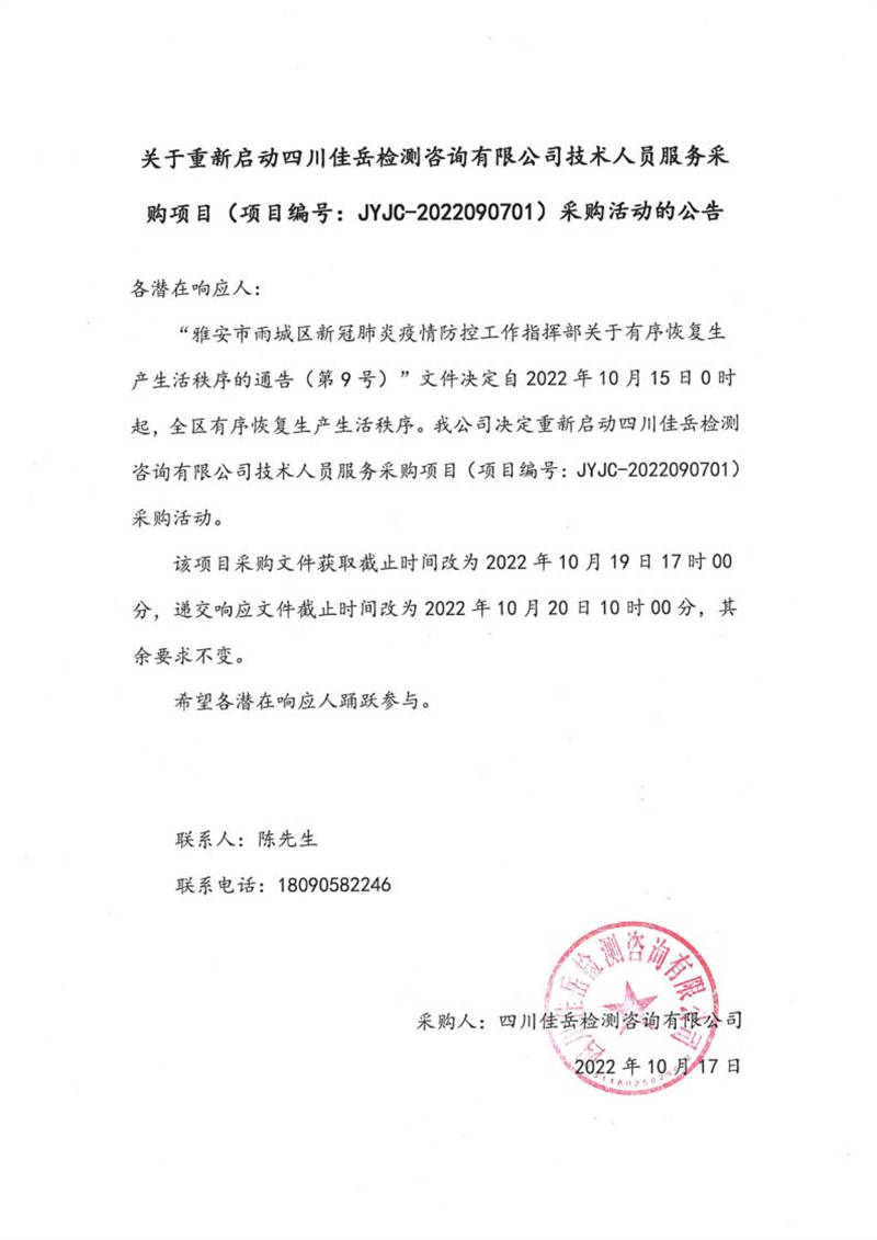 四川佳岳檢測咨詢有限公司關(guān)于重新啟動(dòng)四川佳岳檢測咨詢有限公司技術(shù)人員服務(wù)采購項(xiàng)目(項(xiàng)目編號(hào):JYJC-2022090701)采購活動(dòng)的公告