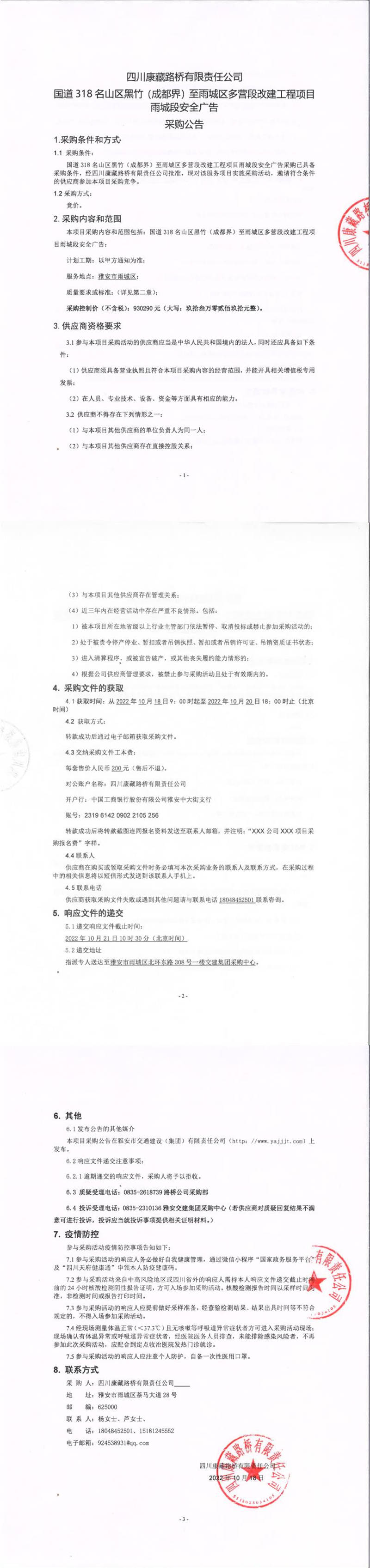 四川康藏路橋有限責(zé)任公司國(guó)道318名山區(qū)黑竹(成都界)至雨城區(qū)多營(yíng)段改建工程雨城段安全廣告采購(gòu)公告