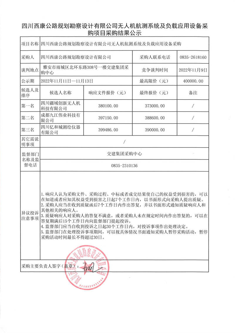 四川西康公路規(guī)劃勘察設(shè)計(jì)有限公司無人機(jī)航測系統(tǒng)及負(fù)載應(yīng)用設(shè)備采購項(xiàng)目采購結(jié)果公示