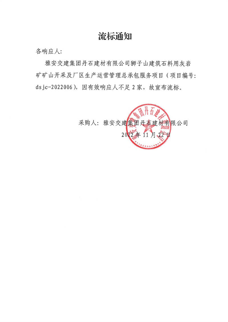 雅安交建集團(tuán)丹石建材有限公司獅子山建筑石料用灰?guī)r礦礦山開采及廠區(qū)生產(chǎn)運營管理總承包服務(wù)項目采購流標(biāo)通知