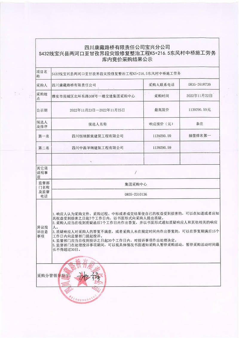 四川康藏路橋有限責任公司寶興分公司S432線寶興縣兩河口至甘孜界段災(zāi)毀修復(fù)整治工程K5+216.5東風村中橋施工勞務(wù)庫內(nèi)競價采購結(jié)果公示