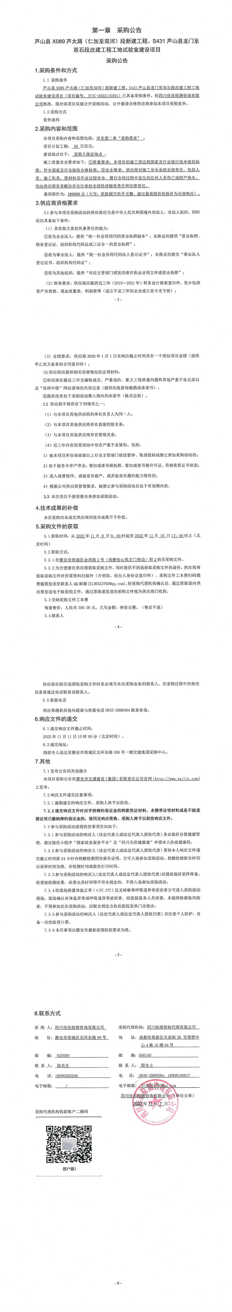 四川佳岳檢測(cè)咨詢有限公司蘆山縣X089蘆太路(仁加至雙河)段新建工程、S431蘆山縣龍門至雙石段改建工程工地試驗(yàn)室建設(shè)項(xiàng)目采購公告