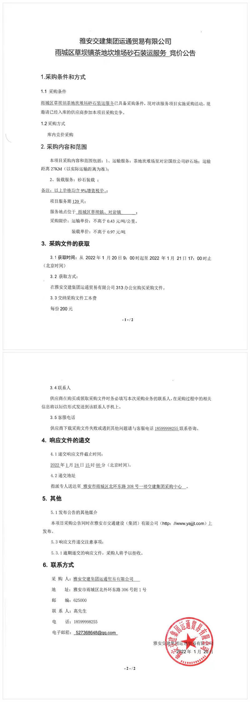 雅安交建集團(tuán)運(yùn)通貿(mào)易有限公司雨城區(qū)草壩鎮(zhèn)茶地坎堆場(chǎng)砂石裝運(yùn)服務(wù)競(jìng)價(jià)公告