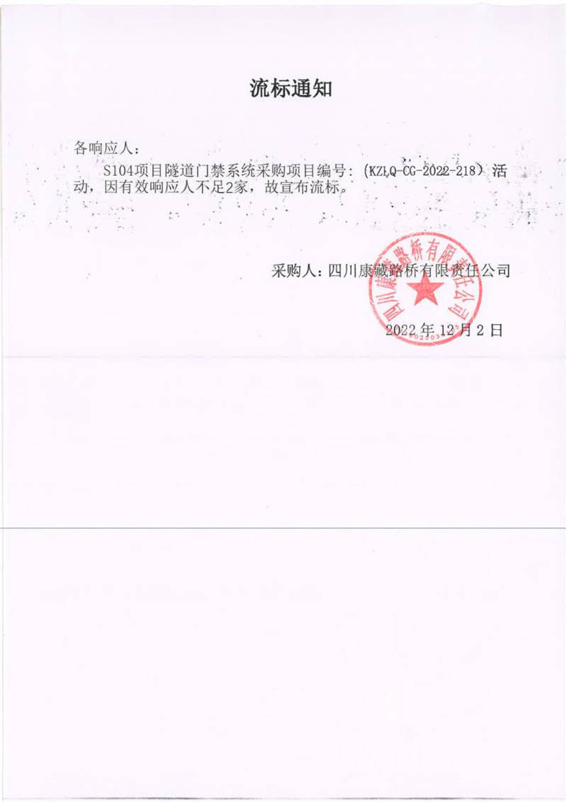 四川康藏路橋有限責(zé)任公司S104項(xiàng)目隧道門(mén)禁系統(tǒng)流標(biāo)通知
