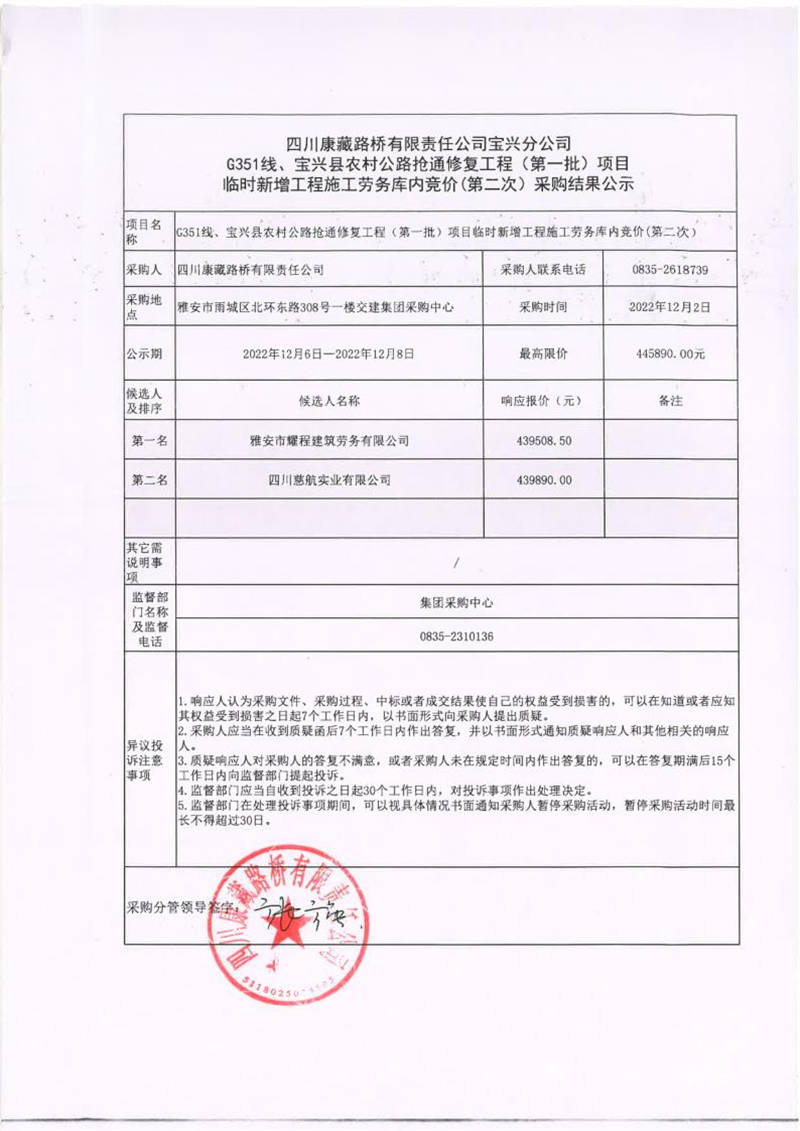 四川康藏路橋有限責(zé)任公司寶興分公司G351線、寶興縣農(nóng)村公路搶通修復(fù)工程(第一批)項(xiàng)目臨時(shí)新增工程施工勞務(wù)庫(kù)內(nèi)競(jìng)價(jià)(第二次)采購(gòu)結(jié)果公示