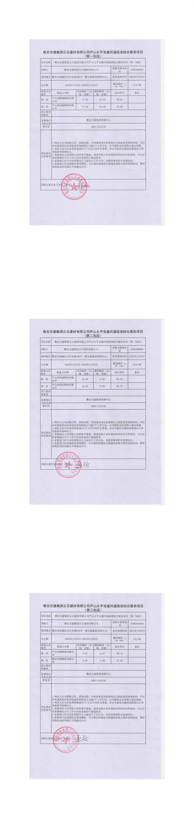 雅安交建集團云石建材有限公司蘆山太平寶盛河道疏浚綜合服務項目(第一包段、第二包段、第三包段)結果公示
