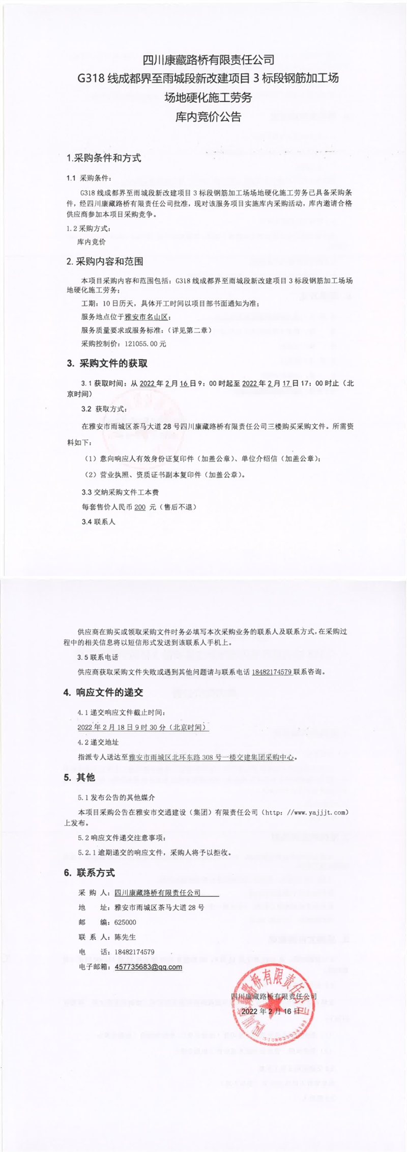 四川康藏路橋有限責(zé)任公司G318線成都界至雨城段新改建項(xiàng)目3標(biāo)段鋼筋加工場場地硬化施工勞務(wù)庫內(nèi)競價公告
