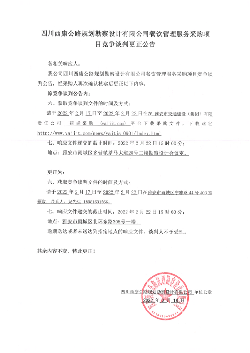 四川西康公路規(guī)劃勘察設(shè)計(jì)有限公司餐飲管理服務(wù)采購項(xiàng)目競(jìng)爭(zhēng)談判更正公告