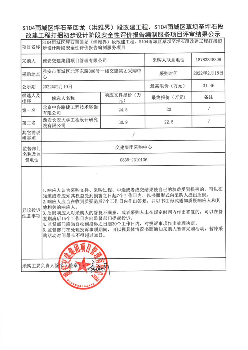 雅安交建集團(tuán)項(xiàng)目管理有限公司S104雨城區(qū)坪石至回龍(洪雅界)段改建工程、S104雨城區(qū)草壩至坪石段改建工程打捆初步設(shè)計(jì)階段安全性評(píng)價(jià)報(bào)告編制服務(wù)項(xiàng)目評(píng)審結(jié)果公示
