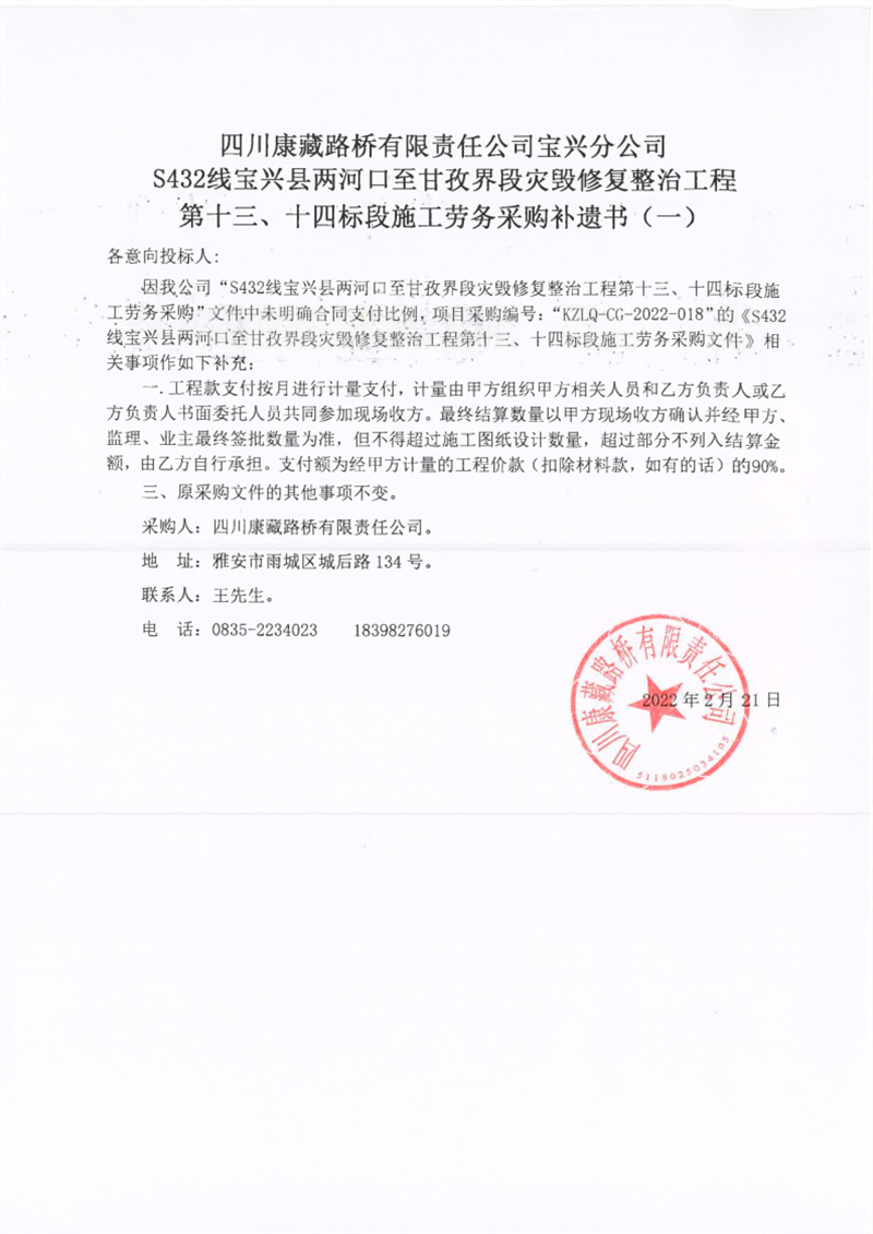 四川康藏路橋有限責(zé)任公司寶興分公司S432線寶興縣兩河口至甘孜界段災(zāi)毀修復(fù)整治工程第十三、十四標(biāo)段施工勞務(wù)采購(gòu)補(bǔ)遺書(一)