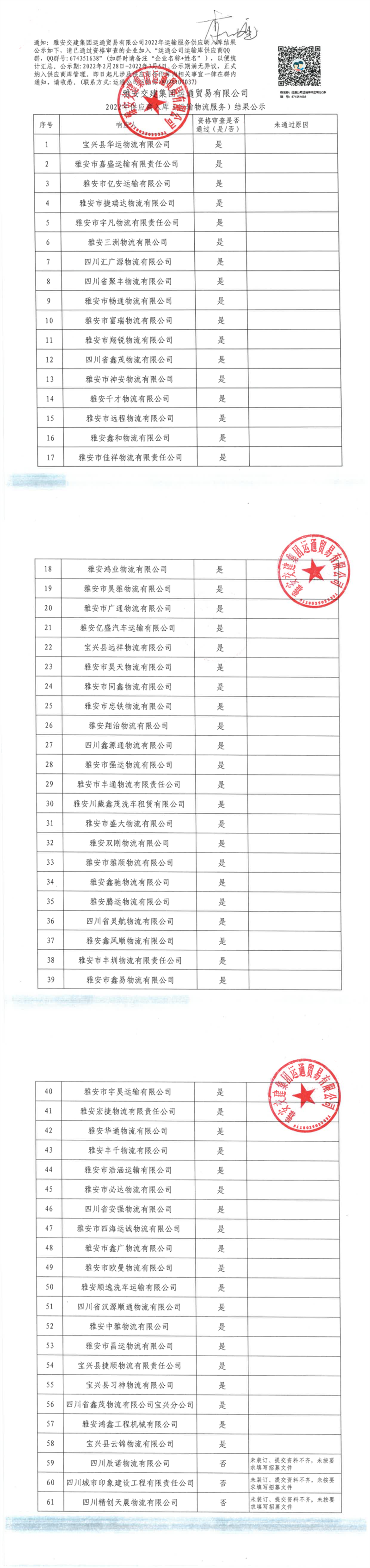 雅安交建集團運通貿易有限公司2022年供應商入庫(運輸物流服務)結果公示