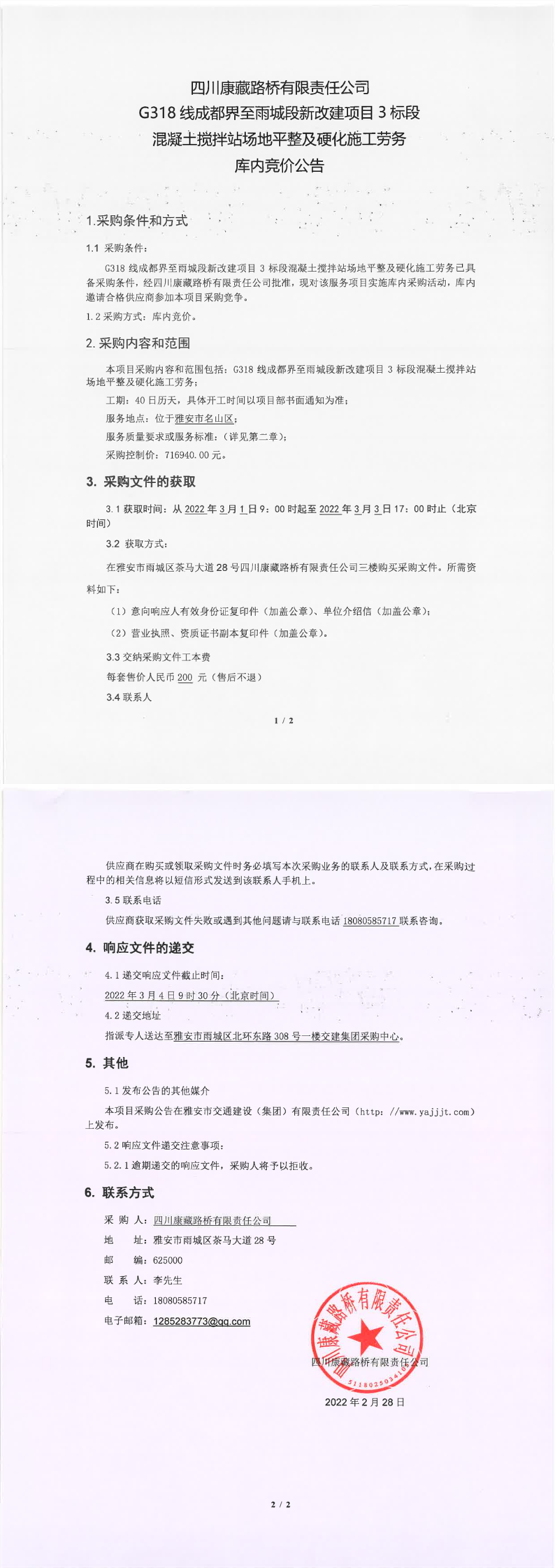 四川康藏路橋有限責(zé)任公司G318線成都界至雨城段新改建項(xiàng)目3標(biāo)段混凝土攪拌站場地平整及硬化施工勞務(wù)庫內(nèi)競價(jià)公告