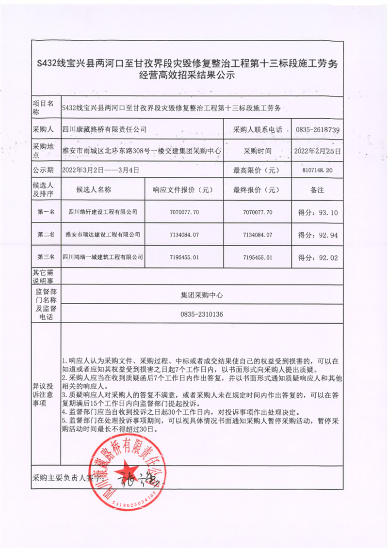 四川康藏路橋有限責(zé)任公司S432線寶興縣兩河口至甘孜界段災(zāi)毀修復(fù)整治工程第十三標(biāo)段施工勞務(wù)經(jīng)營(yíng)高效招采結(jié)果公示