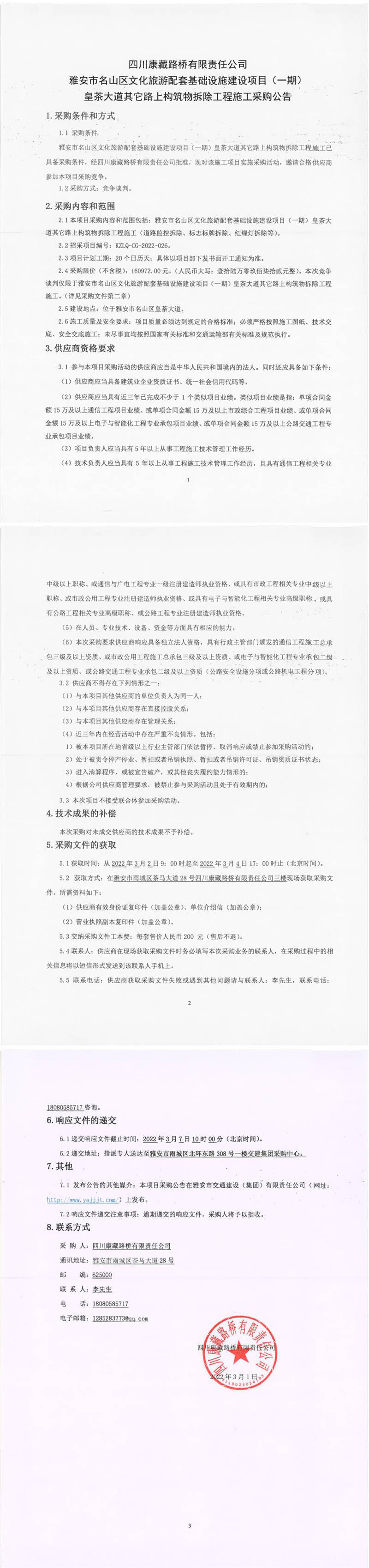四川康藏路橋有限責(zé)任公司雅安市名山區(qū)文化旅游配套基礎(chǔ)設(shè)施建設(shè)項(xiàng)目(一期)皇茶大道其它路上構(gòu)筑物拆除工程施工采購公告