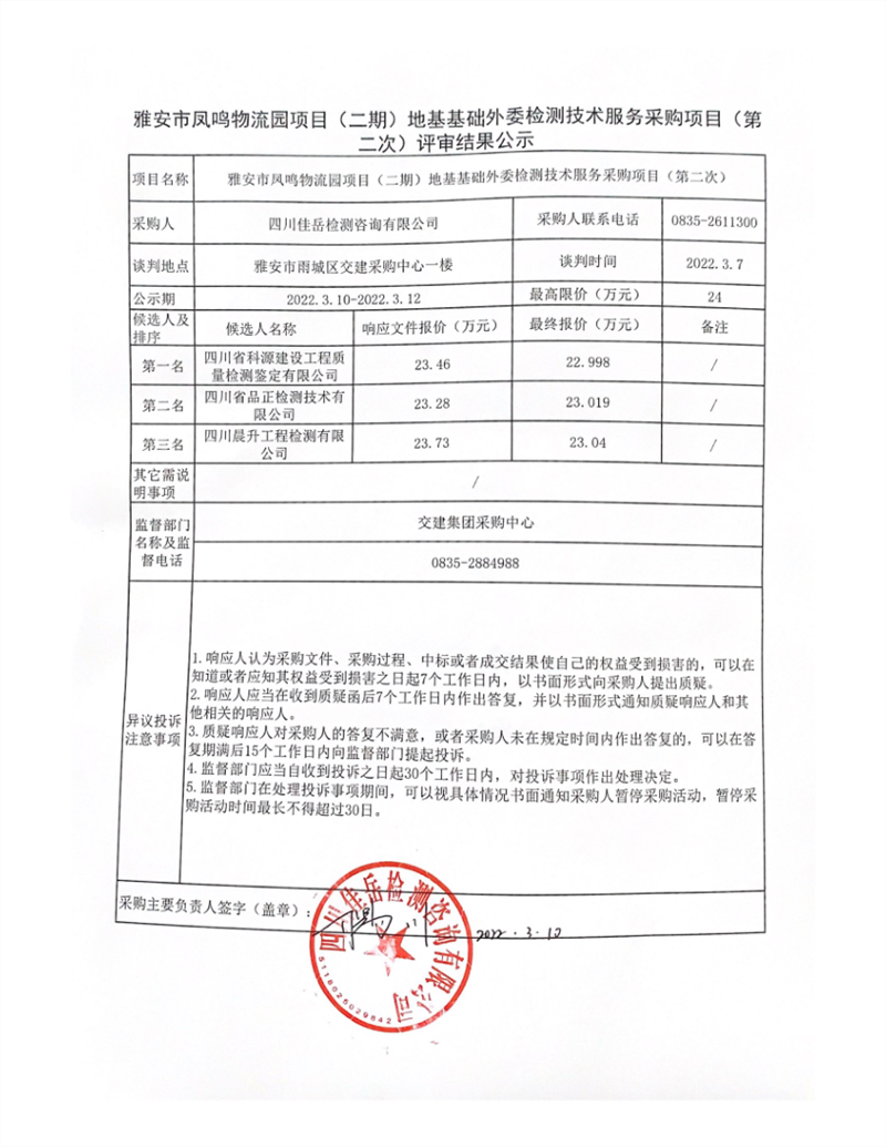 四川佳岳檢測咨詢有限公司雅安市鳳鳴物流園項目(二期)地基基礎外委檢測技術(shù)服務采購項目(第二次)評審結(jié)果公示
