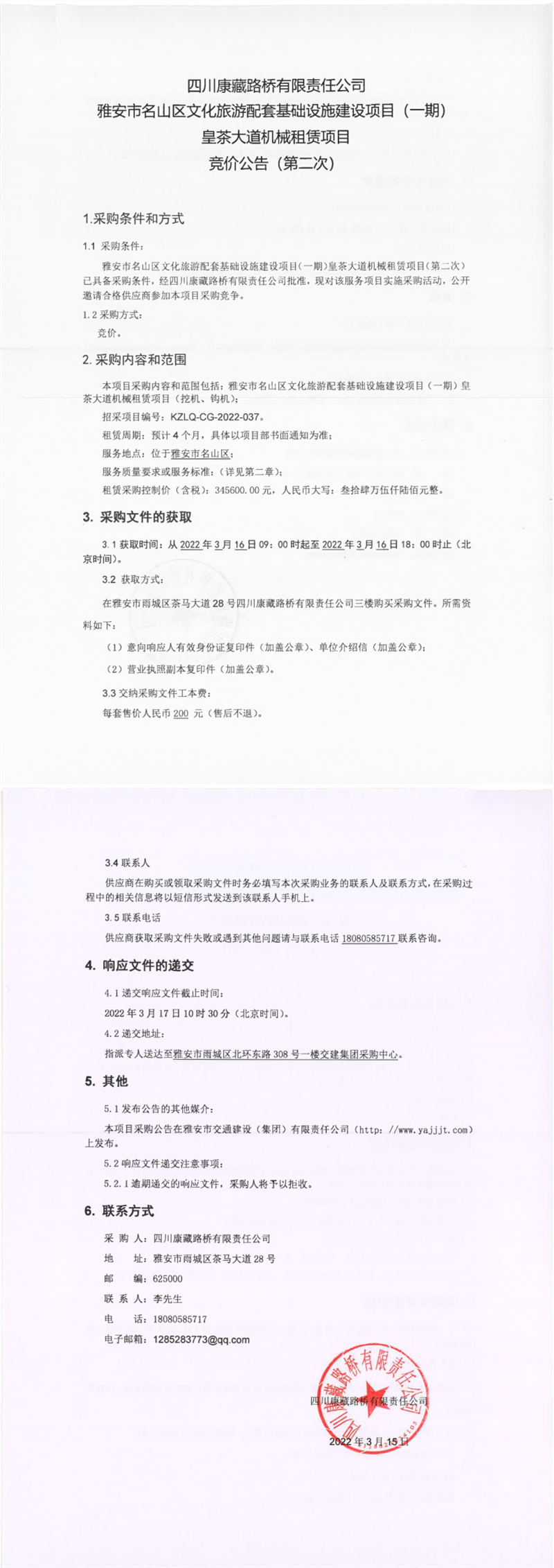 四川康藏路橋有限責(zé)任公司雅安市名山區(qū)文化旅游配套基礎(chǔ)設(shè)施建設(shè)項(xiàng)目(一期)皇茶大道機(jī)械租賃項(xiàng)目競(jìng)價(jià)公告(第二次)