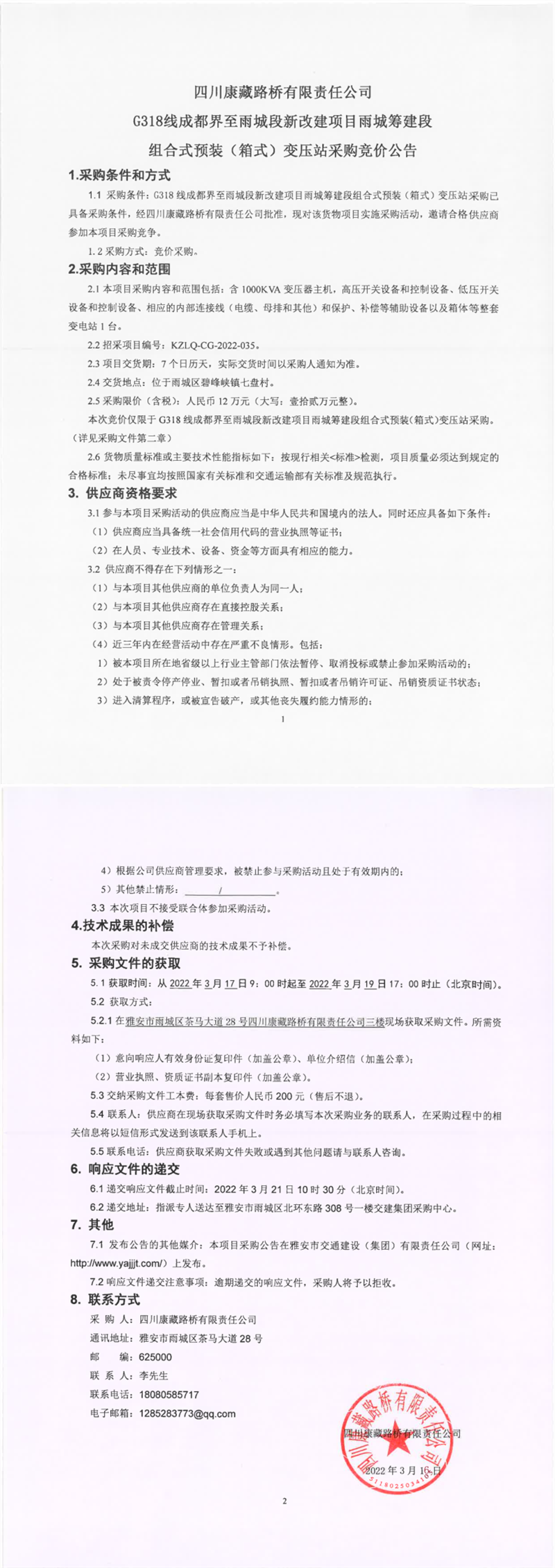 四川康藏路橋有限責(zé)任公司G318線成都界至雨城段新改建項(xiàng)目雨城籌建段組合式預(yù)裝(箱式)變壓站采購競價公告