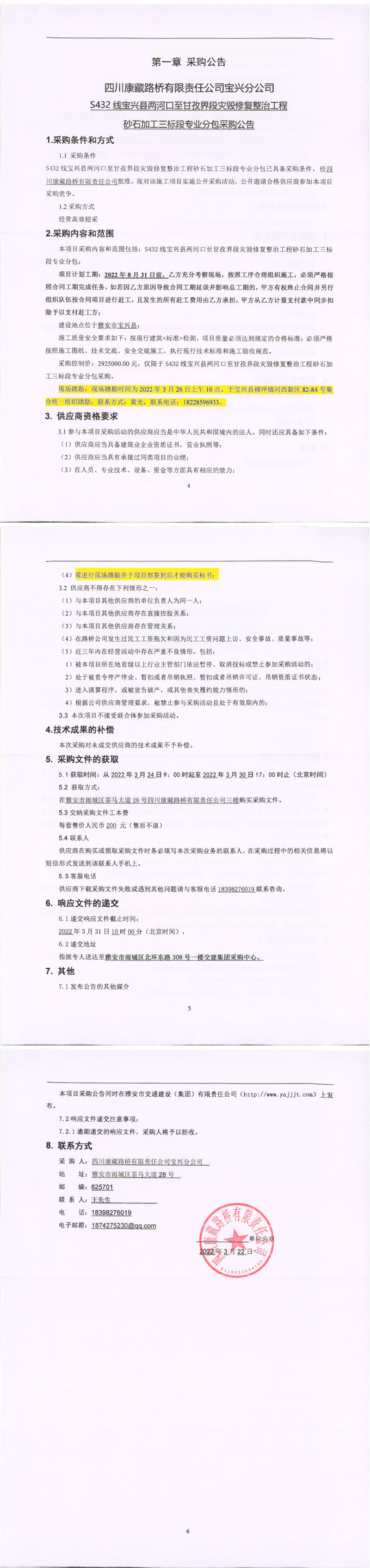 四川康藏路橋有限責(zé)任公司S432線寶興縣兩河口至甘孜界段災(zāi)毀修復(fù)整治工程砂石加工三標段專業(yè)分包采購公告