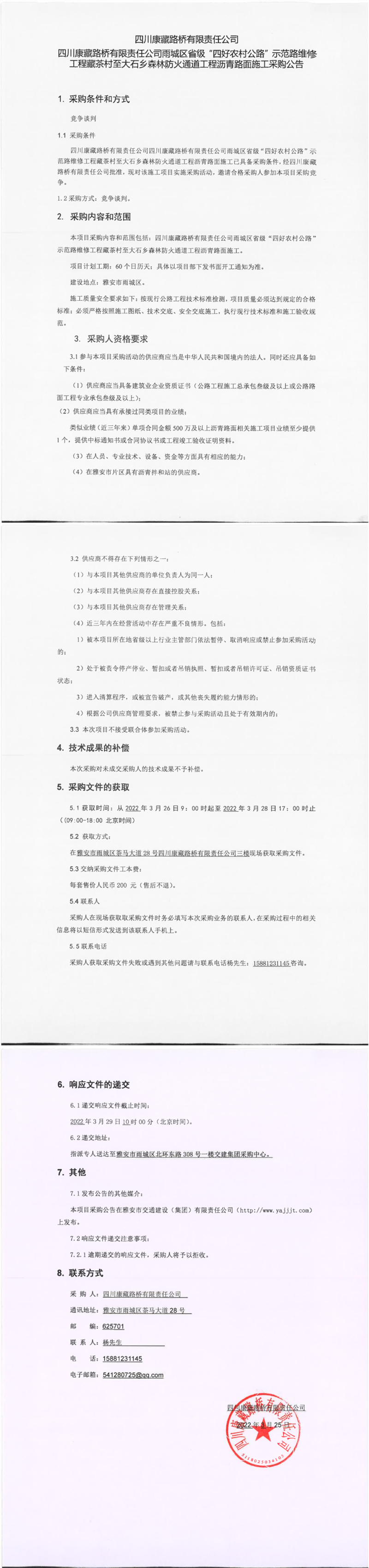 四川康藏路橋有限責任公司雨城區(qū)省級“四好農村公路”示范路維修工程藏茶村至大石鄉(xiāng)森林防火通道工程瀝青路面施工采購公告