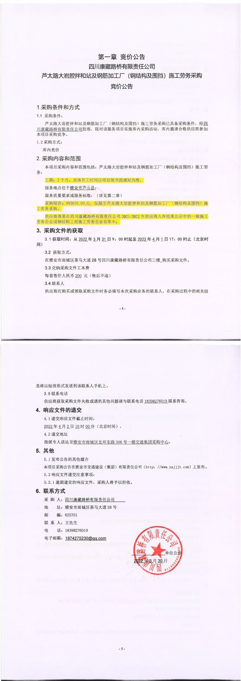 四川康藏路橋有限責任公司蘆太路大巖腔拌和站及鋼筋加工廠(鋼結構及圍檔)施工勞務采購競價公告