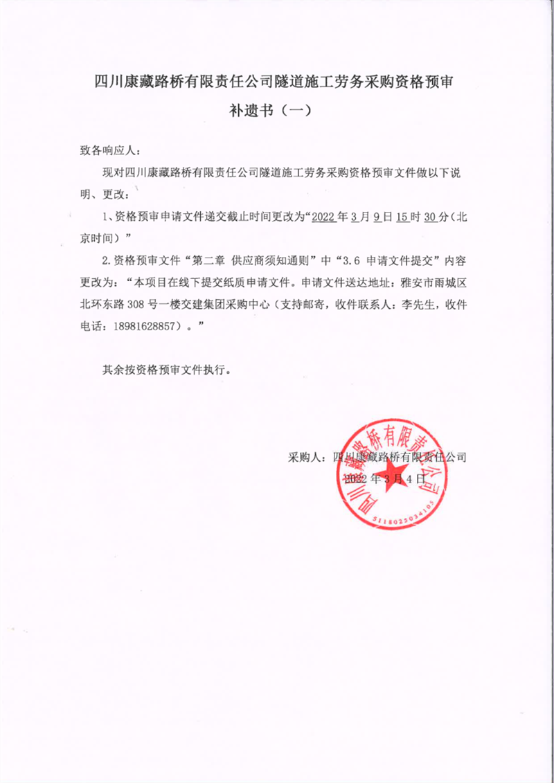 四川康藏路橋有限責任公司隧道施工勞務采購資格預審補遺書(一)