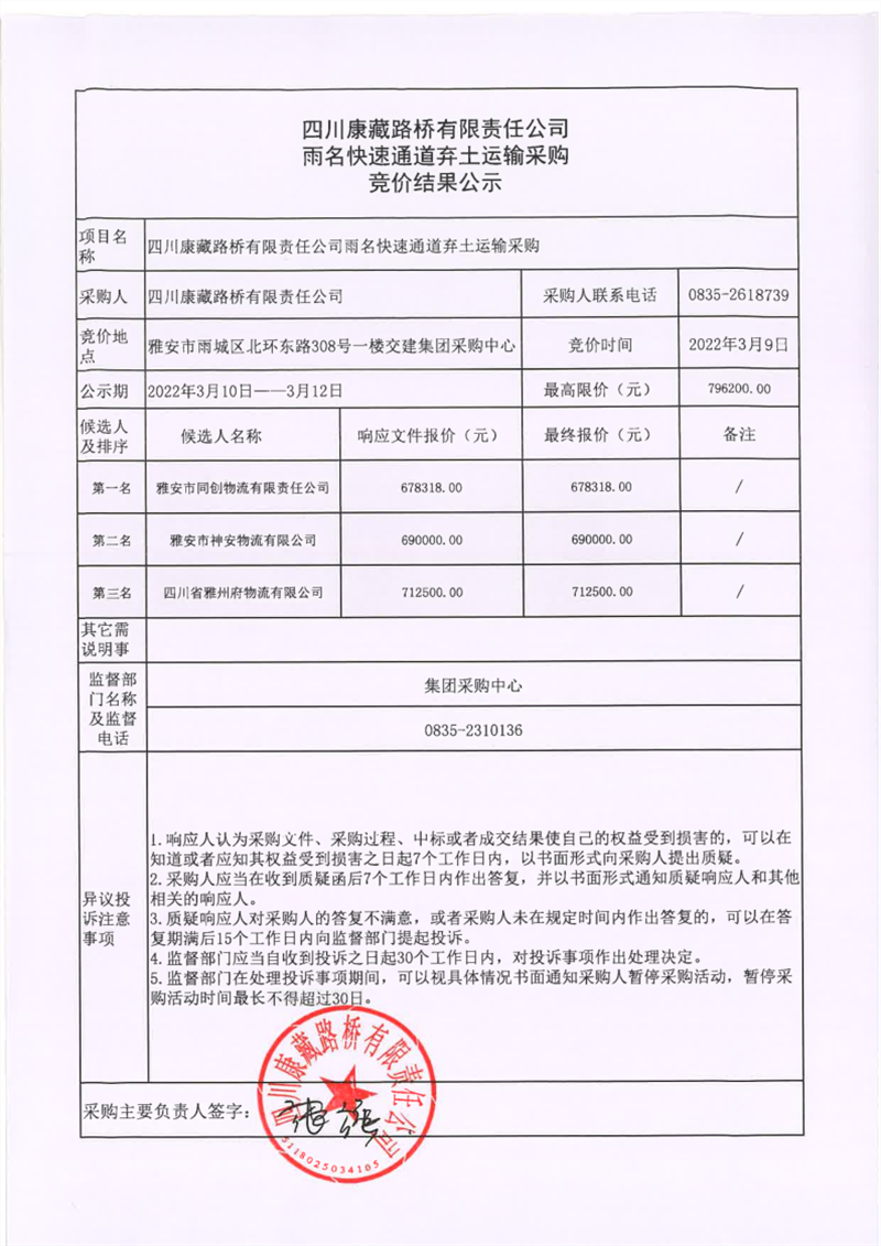 四川康藏路橋有限責任公司雨名快速通道棄土運輸采購競價結果公示