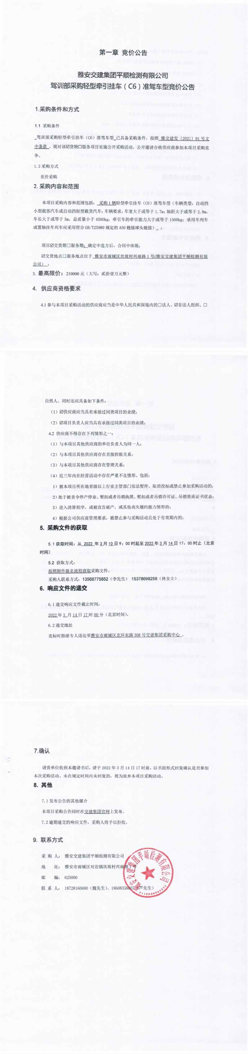 雅安交建集團(tuán)平順檢測有限公司駕訓(xùn)部采購輕型牽引掛車(C6)準(zhǔn)駕車型競價公告