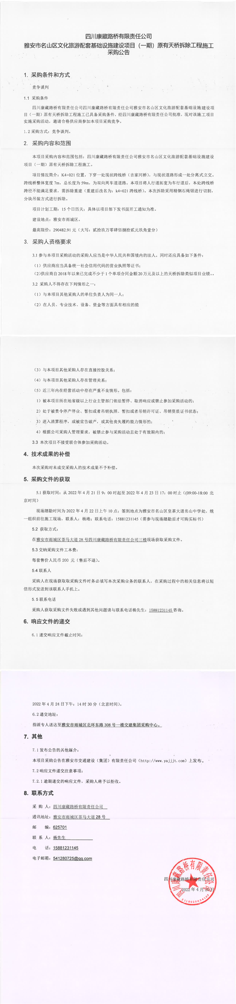 四川康藏路橋有限責任公司雅安市名山區(qū)文化旅游配套基礎設施建設項目(一期)原有天橋拆除工程施工采購公告
