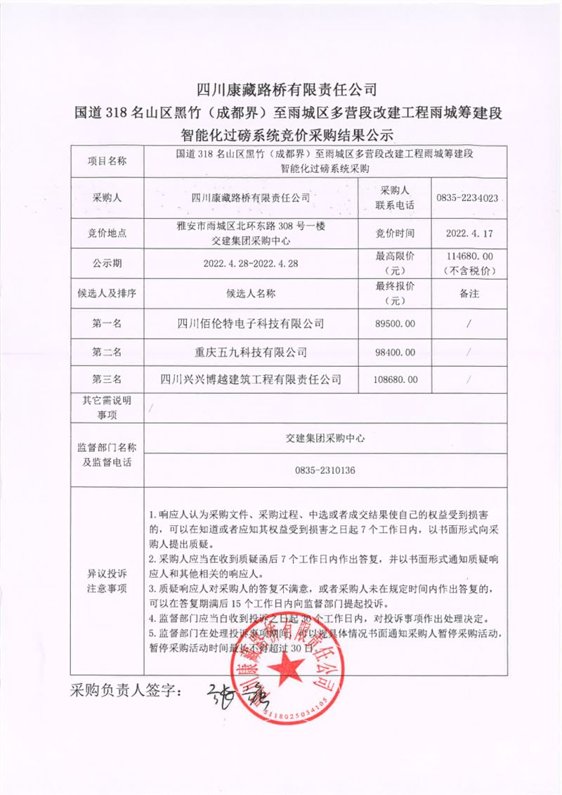 四川康藏路橋有限責(zé)任公司國道318名山區(qū)黑竹(成都界)至雨城區(qū)多營段改建工程雨城籌建段智能化過磅系統(tǒng)競(jìng)價(jià)采購結(jié)果公示