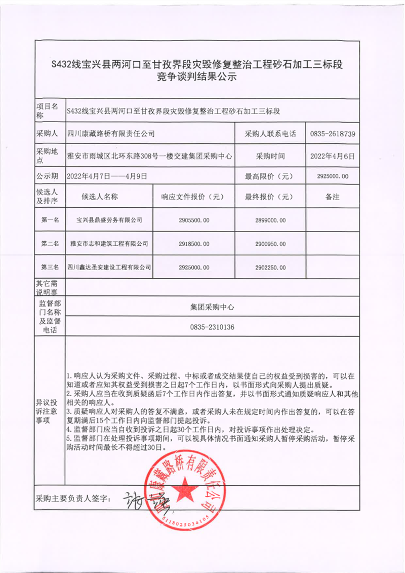 四川康藏路橋有限責(zé)任公司S432線寶興縣兩河口至甘孜界段災(zāi)毀修復(fù)整治工程砂石加工三標段競爭談判結(jié)果公示