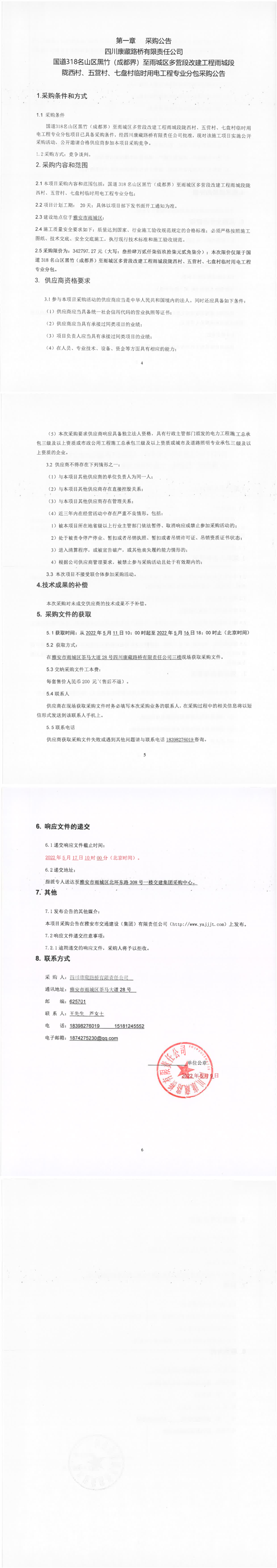 四川康藏路橋有限責(zé)任公司國(guó)道318名山區(qū)黑竹(成都界)至雨城區(qū)多營(yíng)段改建工程雨城段隴西材、五營(yíng)村、七盤村臨時(shí)用電工程專業(yè)分包采購公告