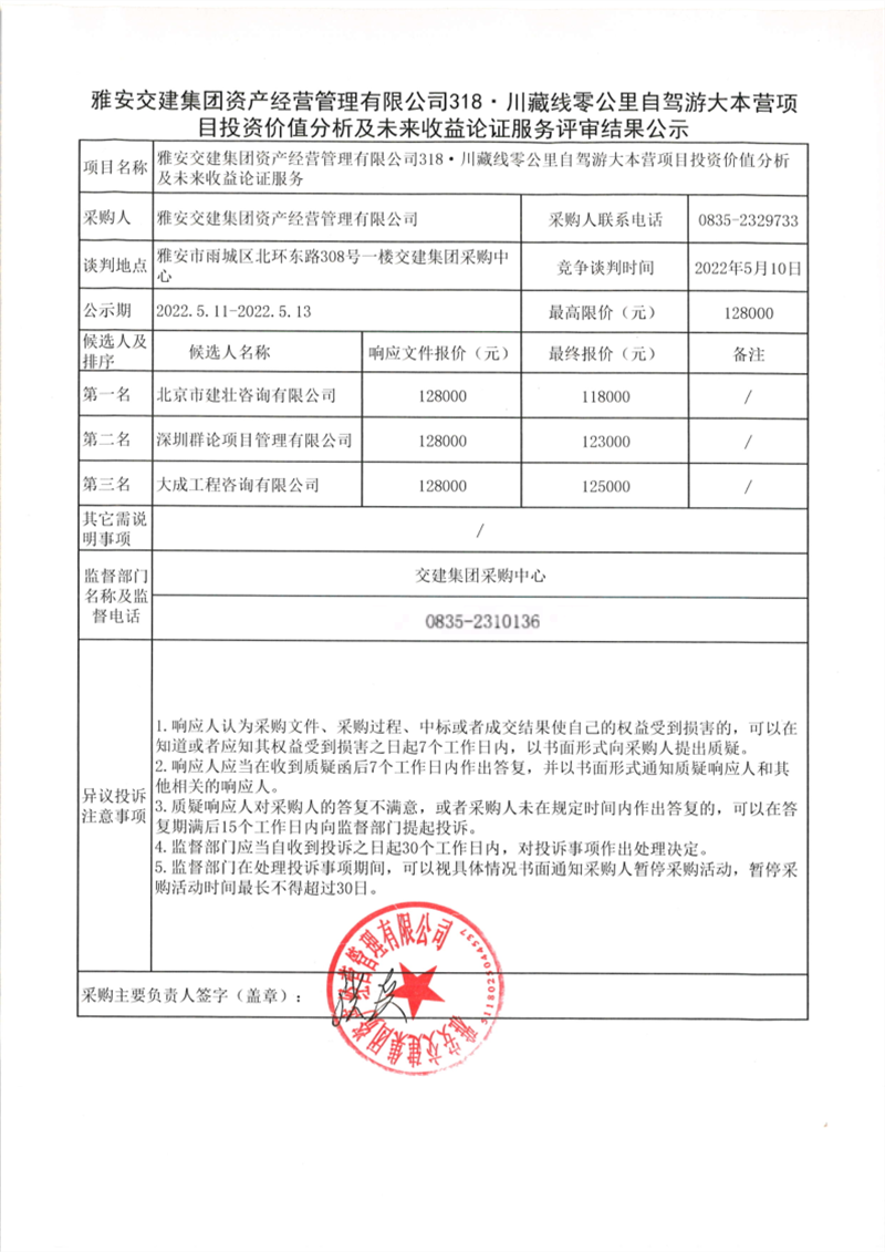 雅安交建集團(tuán)資產(chǎn)經(jīng)營(yíng)管理有限公司318·川藏線零公里自駕游大本營(yíng)項(xiàng)目投資價(jià)值分析及未來(lái)收益論證服務(wù)評(píng)審結(jié)果公示