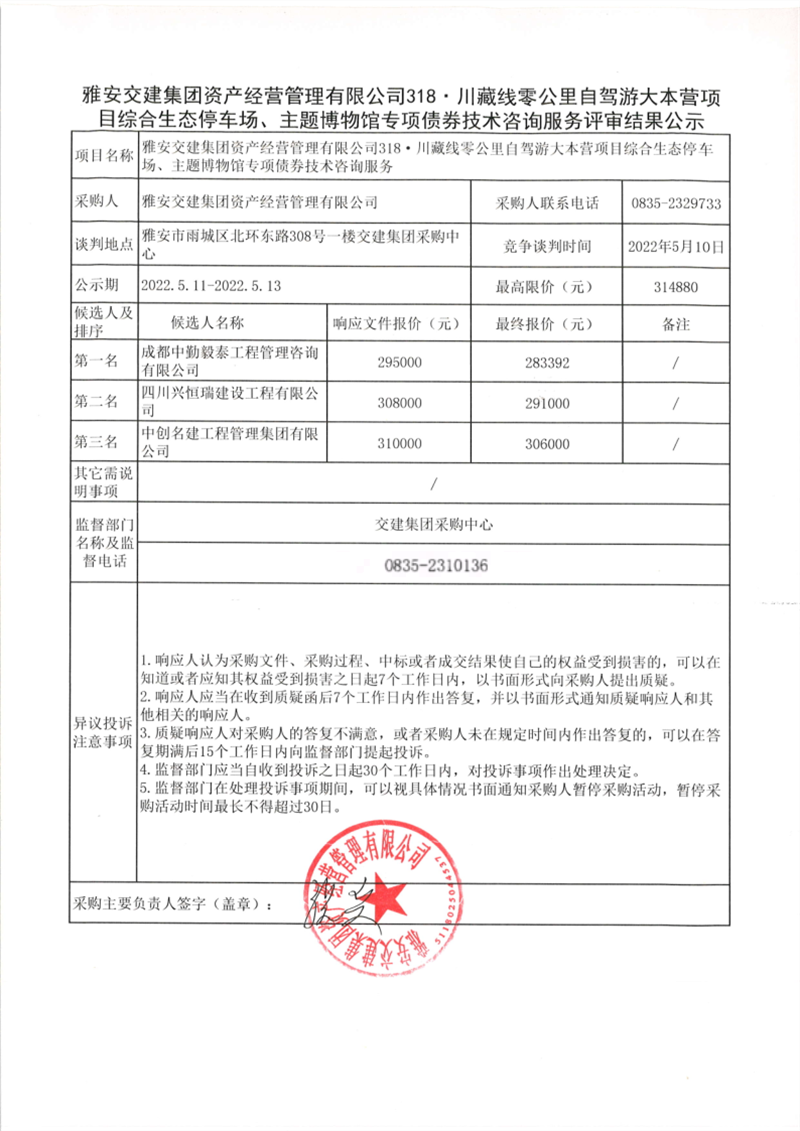 雅安交建集團資產(chǎn)經(jīng)營管理有限公司318·川藏線零公里自駕游大本營項目綜合生態(tài)停車場、主題博物館專項債券技術咨詢服務評審結果公示