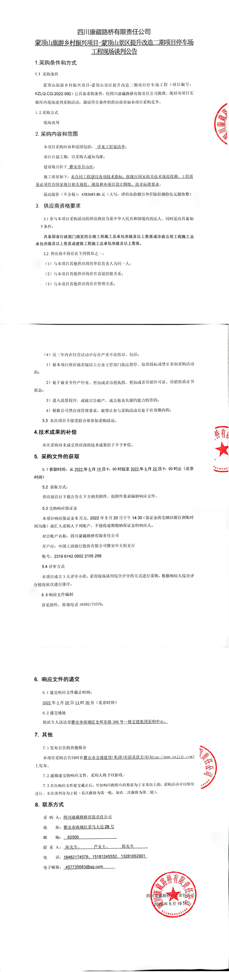 四川康藏路橋有限責任公司蒙頂山旅游鄉(xiāng)村振興項目-蒙頂山景區(qū)提升改造二期項目停車場工程現(xiàn)場談判公告