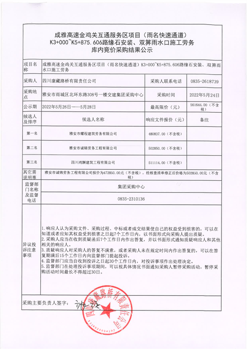 四川康藏路橋有限責(zé)任公司成雅高速金雞關(guān)互通服務(wù)區(qū)項(xiàng)目(雨名快速通道)K3+000~K5+875.606路緣石安裝、雙箅雨水口施工勞務(wù)庫(kù)內(nèi)競(jìng)價(jià)采購(gòu)結(jié)果公示