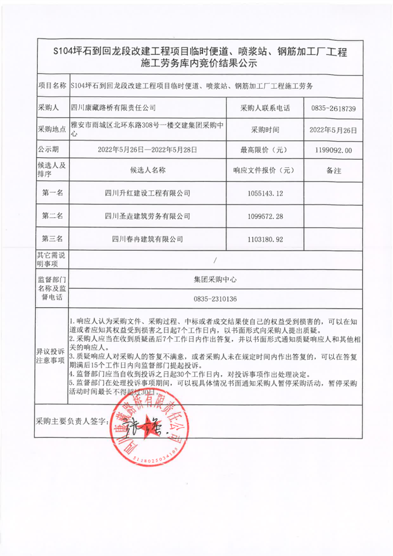 四川康藏路橋有限責任公司S104坪石到回龍改建工程項目臨時便道、噴漿站、鋼筋加工廠工程施工勞務庫內(nèi)競價結(jié)果公示