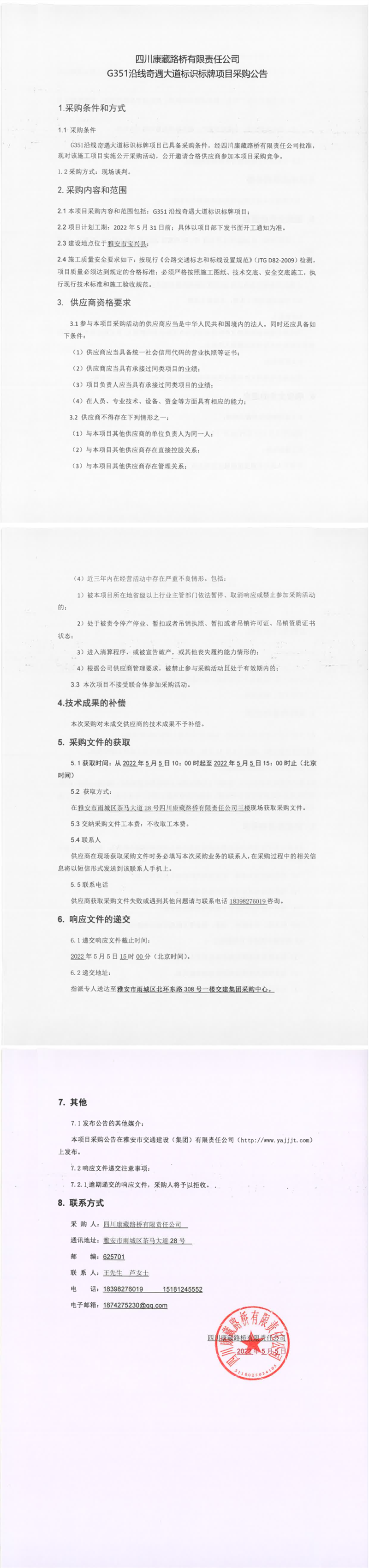 四川康藏路橋有限責任公司G351沿線奇遇大道標識標牌項目采購公告