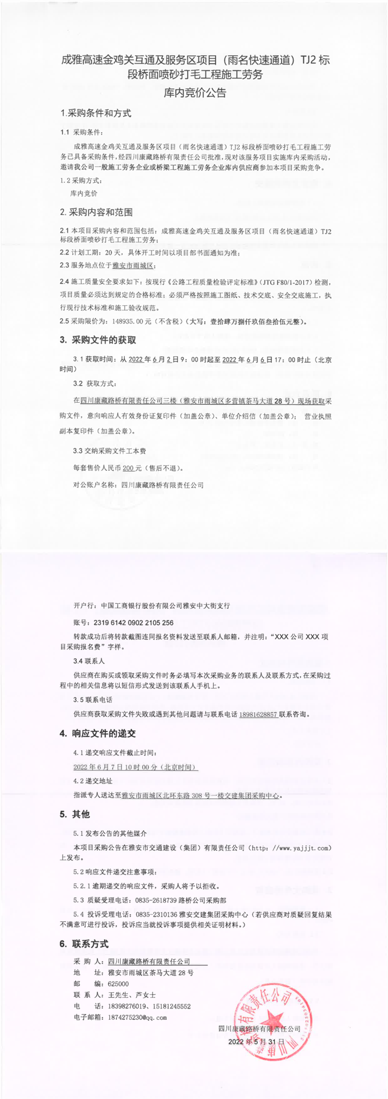 四川康藏路橋有限責(zé)任公司成雅高速金雞關(guān)互通及服務(wù)區(qū)項(xiàng)目(雨名快速通道)TJ2標(biāo)段橋面噴砂打毛工程施工勞務(wù)庫內(nèi)競價(jià)公告