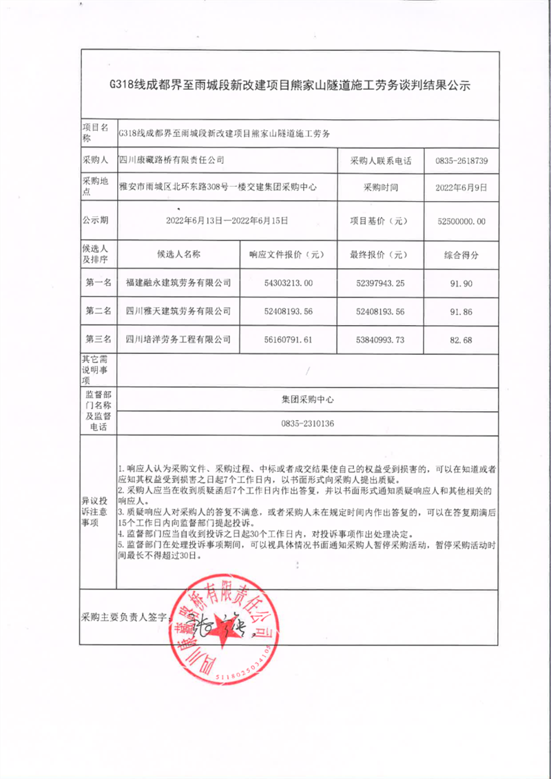 四川康藏路橋有限責(zé)任公司G318線成都界至雨城段新改建項(xiàng)目熊家山隧道施工勞務(wù)談判結(jié)果公示