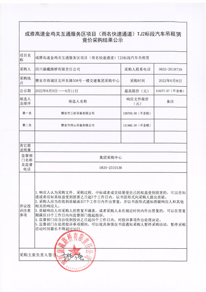 四川康藏路橋有限責任公司成雅高速金雞關互通服務區(qū)項目(雨名快速通道)TJ2標段汽車吊租賃競價采購結果公示