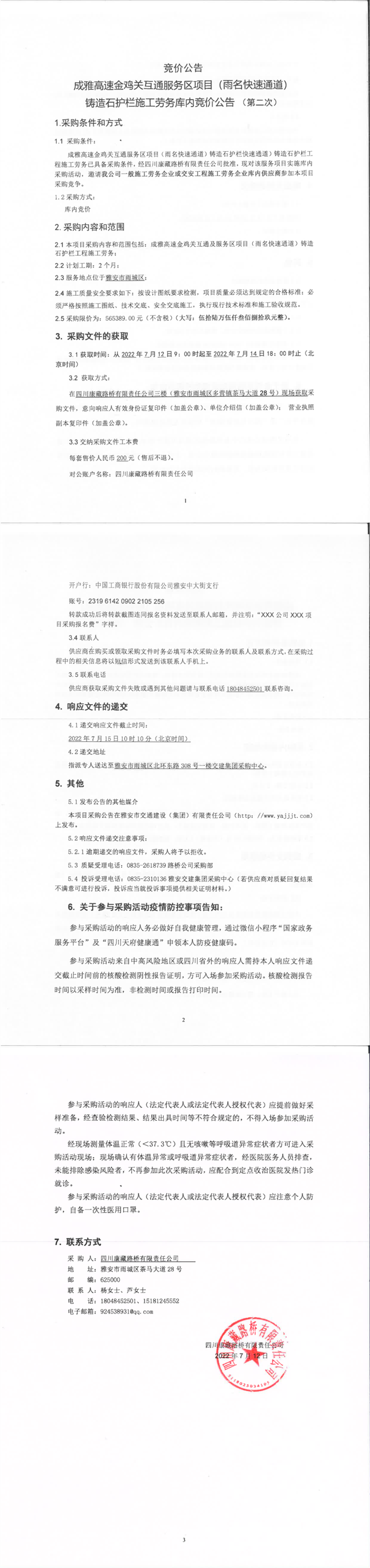 四川康藏路橋有限責(zé)任公司成雅高速金雞關(guān)互通服務(wù)區(qū)項(xiàng)目(雨名快速通道)鑄造石護(hù)欄施工勞務(wù)庫(kù)內(nèi)競(jìng)價(jià)公告(第二次)