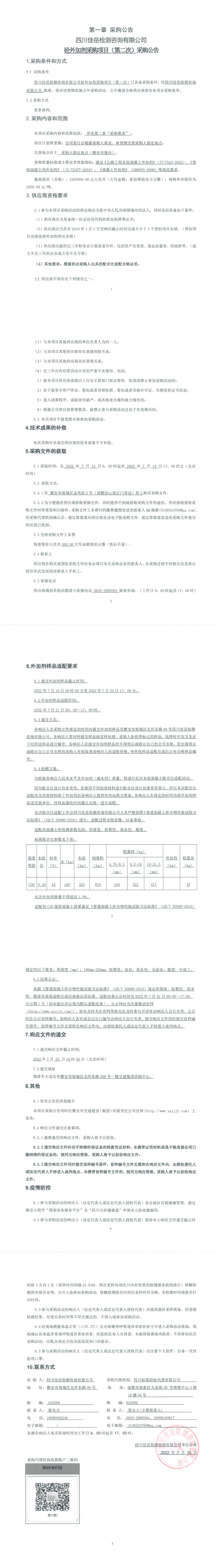 四川佳岳檢測咨詢有限公司砼外加劑采購項目(第二次)采購公告
